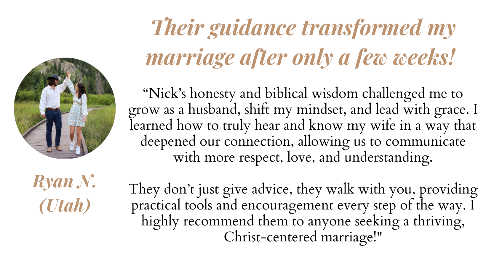 “I highly recommend Nick as a marriage coach. He’s relatable, honest, and makes the process comfortable while providing practical insights. In just a few sessions, we saw real progress, and his tools made a lasting impact. His guidance has truly been invaluable in strengthening our marriage!"